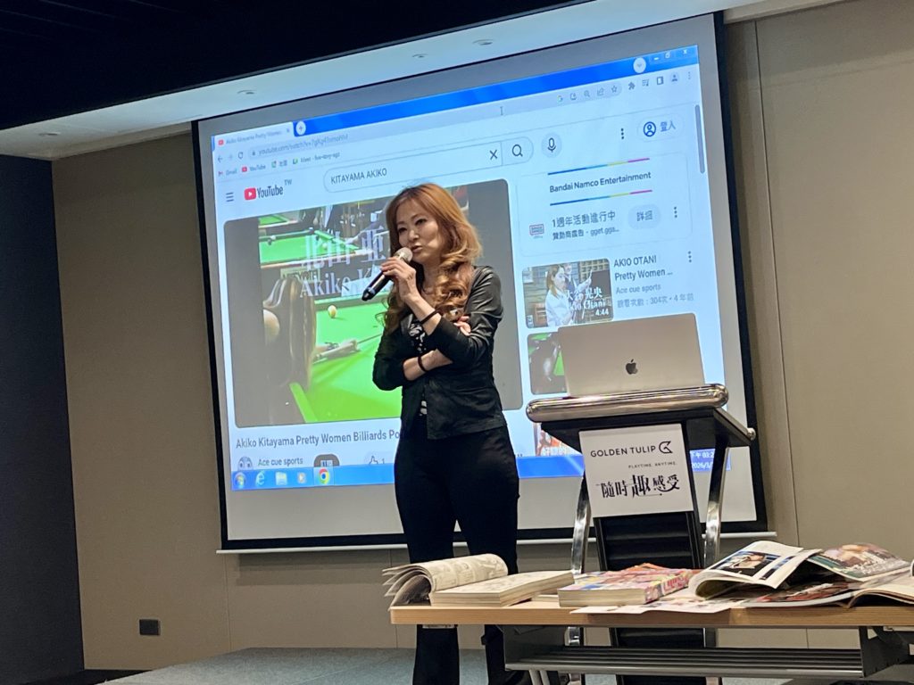 講演では、プロビリヤード選手になったきっかけや、日本と台湾におけるビリヤード事情の違い、さらには業界の発展に向けた取り組みなど、幅広い内容をわかりやすくお話しいただきました。また、日台の芸能にまつわるエピソードも交えながら、終始和やかな雰囲気で進行しました。